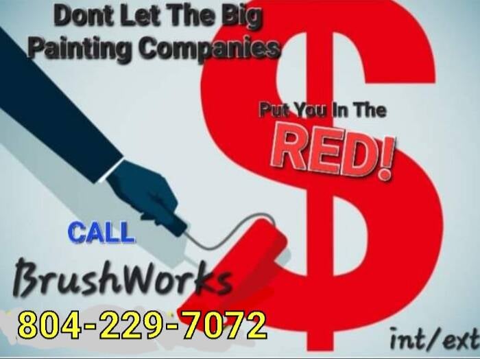 Don't let the price of the bigger painting companies keep you from completing a painting project! Call a SMALL painting service that doesn't mind Saving you MONEY BrushWorks Painting Services RVA 804-229-7072.
